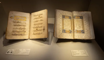 🔸 الجناح الخامس يحمل في طياته نفحات روحانية من خلال عرض مخطوطات قرآنية نادرة تعود للقرنين الثاني حتى الرابع عشر الهجري، إلى جانب لوحات مزخرفة بالخط العربي، وألواح خشبية استخدمت لتحفيظ القرآن، ما يعكس تقديس العلم والقرآن لدى المسلمين.